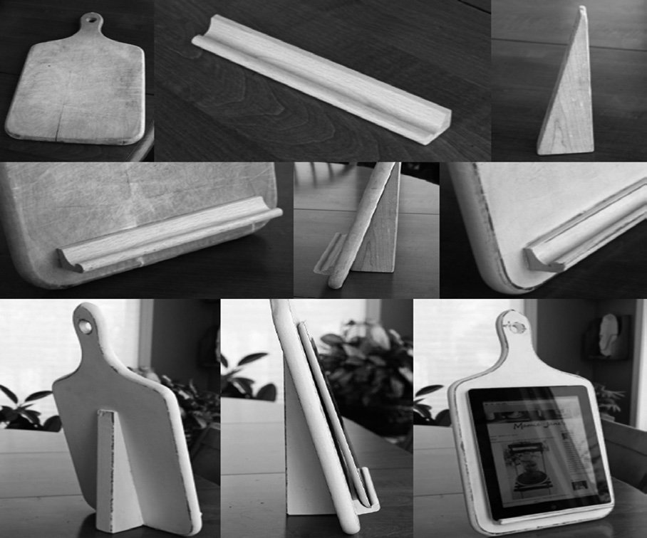 Stojalo za vašo tablico lahko naredite tudi sami. Potrebujemo: Staro kuhinjsko desko, dva odpadna kosa lesa in lepilo za les. Če želite lahko desko prebarvate s poljubno barvo za les. In naj se kuhanje prične.