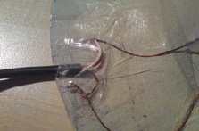 - Vse skupaj pritrdite z lepilnim trakom. Pazite, da se + in 0 ne bosta dotikala, da ne bo kratkega stika!