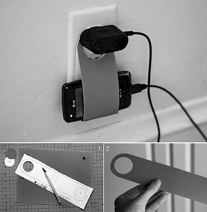 IZ TRAKA BLAGA, USNJA ALI IZ DEBELEŠEGA, A PROŽNEGA PAPIRJA LAHKO KOT JE RAZVIDNO IZ SLIKE ZHORAJ IZDELATE DRŽALO ZA POLNILEC, KI BO OB POLNJENJU DRŽALO MOBILNIK.
