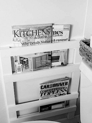 IZ STARE PALETE LAHKO NASTANE STOJALO ZA REVIJE. LES PREBARVAJTE IN PREMAŽITE, PRILAGODITE KAKŠNO LETVICO, ČE JE POTREBNO IN VSTAVITE REVIJE.
