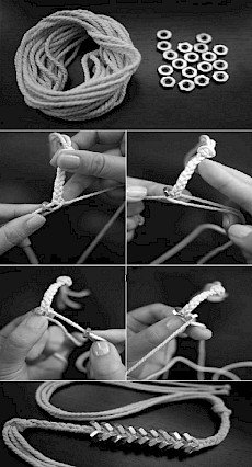 IZ TREH VRVI SPLETETE KITO. NA POLJUBNI TOČKI (GLEDE NA ŽELJO KONČNEGA VIDEZA ZAPESTNICE) POVEZNITE MATICO NA LEVO VRVICO, NATO PA Z DRUGO VRVICO PREČITE, KOT BI NADALJEVALI PLETENJE KITE. NA PREOSTALO DESNO VRVICO POVEZNITE DRUGO MATICO IN PONOVNO PREČITE. TO PONAVLJAJTE - PRI ČEMER SE BODO MATICE VPLETLE V KITO. REZULTAT JE ZANIMIVA ZAPESTNICA, PRIMERNA ZA OBA SPOLA.