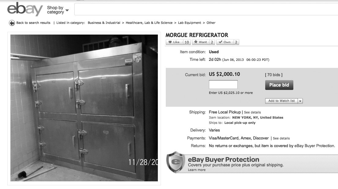 Na spletnem portalu eBay se je znašel hladilnik za mrtvašnice. Prodaja ga psihiatrična bolnišnica iz Manhattna. Malce bizarno oglas navaja sijajen srebrni lesk, štiri vratca za trupla, ki imajo sicer znake obrabe, a so popolnoma funkcionalna. Hladilnik lahko kupi kdor koli .- če ga bo le osebno prevzel. V času pisanja te novičke je bilo preko 70 ponudb, cena pa je dosegla 2000 ameriških dolarjev.