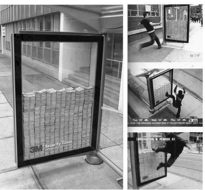 Oglaševalska kampanja podjetja 3M je sredi mesta postavila primerek njihovega neprebojnega stekla. Med dve plasti stekla so namestili denar - oglaševano tri milijone. Kdor bi uničil ali prebil steklo, bi torej lahko pobasal denar. Uspelo bojda ni nikomur, je pa med steklenima ploščama bivalo le za okoli 700 evrov pravega denarja - kar pomeni, da le niso bili povsem prepričani v neprebojnost strukture, vsekakor pa jim priznamo domiselno oglaševalsko potezo.