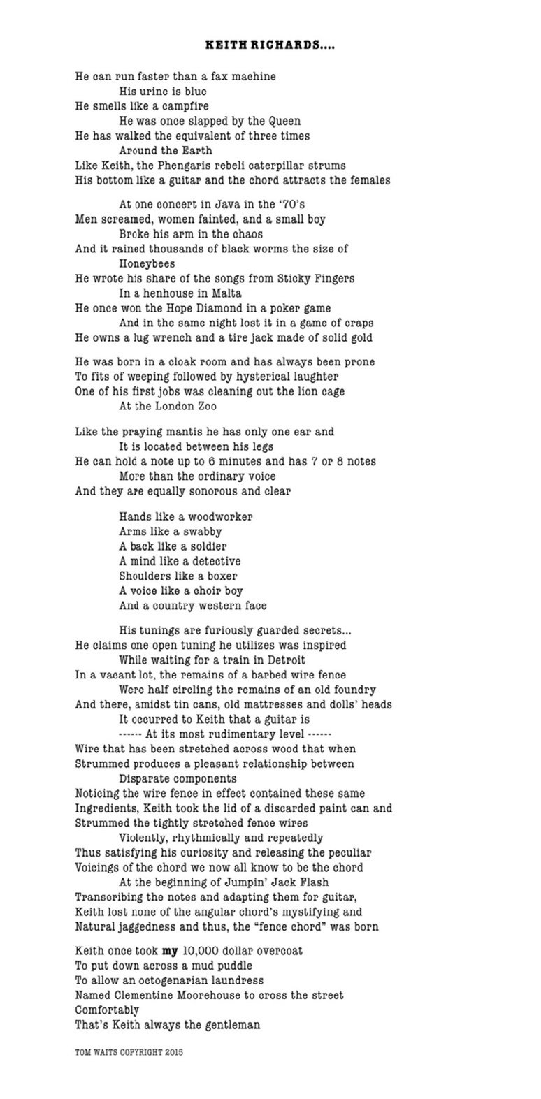 Tom Waits se je z orginalno pesmijo v svojem stilu, z največjo pozornostjo, ki mogoče že meji na malce čudaško gesto, poklonil svojemu glasbenemu in osebnemu prijatelju Keith Richardsu.