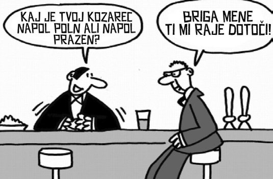 Realizma ni. So le bolj ali manj verodostojne ocene stvarnosti in bolj ali manj drzni računi s prihodnostjo. Zgovorna je anekdota kozarca z vodo. Kozarec je videti na pol poln ali pa na pol prazen. Gre za lekcijo o vlogi posameznega pogleda na stvarnost. Pesimisti vidijo kozarec pol prazen, optimisti vidijo pol polnega kozarca. Stvarnost je veliko bolj kompleksna od tega. V kozarcu je namreč pol tekočine in pol zraka. Ker je tekočina prozorna, je v kozarcu najbrž voda. Lahko, pa da je not tekila. Ali pa strup. Morda pomembno zdravilo. Kaj pa če tekočina vsebuje vzorec genetskega zapisa mamuta ali pa neznanega bitja iz vesolja. Kaj je realen pogled na vsebino kozarca?