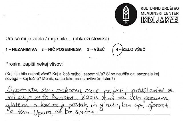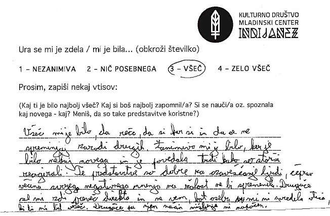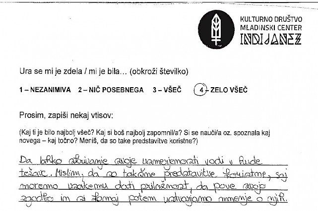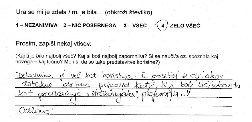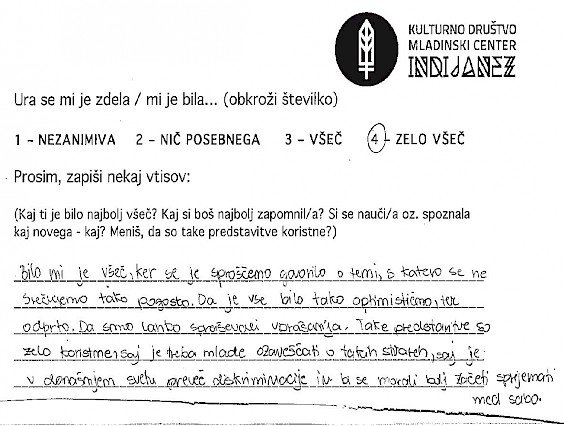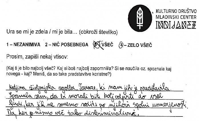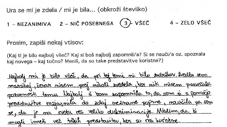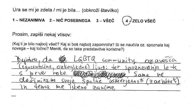 Priprava na vstop v razred, v katerem govorim eno šolsko uro o sebi mi sprva nekako ni šla. Imela sem svoje zapiske oziroma oporne točke, ki so mi bile v pomoč, če se izgubim, ali če se zgodi, da naenkrat ne bom več vedela o čem govoriti. Kar se sicer zdi malo smešno, saj bi morala 23 let življenja zlahka spraviti v 45-minutno obnovo... a se vseeno malo lovim, tu in tam. Poudarek je na moji spolni usmerjenosti, ki je trenutno homoseksualna in na mojem videzu, ki ne ustreza ravno današnji tipični družbeni opredelitvi za žensko. Na meni so opazna moška oblačila oziroma značilen moški videz. Pojasnitev za to je preprosta, tako mi ustreza. Od svojega »coming out-a« mi je zmeraj bilo lahko govoriti o sebi do take mere, da so ljudje, ki so me spoznali, bili večinoma začudeni nad mojo iskrenostjo. A ko sem se zavestno postavila pred razred, da jih o nečem poučim oziroma ozavestim, se mi je seveda zastavilo vprašanje kako in kaj. Želela sem jim približati bistvo, ki me osrečuje in za katerega menim, da bi vsakogar, ki še tega ni ozavestil. Prepričana sem, da dokler drugemu ne škodiš s tem kdo si, kaj delaš in koga ljubiš, s tabo ni nič narobe..bodi kdo si. Čeprav se je tema navezovala na istospolno usmerjenost, kot tudi transseksualnost, transspolnost in podobno, so moji upi segali v smer, da ne bom le spremenila diskriminacijska mišljenja o LGBT ( lezbijke, geji, biseksualci, transseksualci in transspolne osebe) populaciji, ampak da mi bo uspelo tudi spremeniti diskriminacijsko mišljenje dijakov na splošno. Ne glede na spolno usmerjenost, spolno identiteto, itd. se veliko ljudi obremenjuje oziroma jih je strah izražati samega sebe ter preprosto biti in živeti po svojem občutenju. Kot že zapisano, takšno je bilo moje upanje, ni pa bilo moje pričakovanje, da mi bo to dejansko uspelo. Zdi se mi namreč nesmiselno od nekoga pričakovati, da sprejme nekaj v kar sama verjamem. To je odločitev vsakega posameznika. Zato tudi nisem imela pričakovanj, kakšni bodo odzivi dijakov, čeprav so se mi v mislih porajale razne ideje. Tako zame kot za dijake sem si želela le najbolje. Da me ne bi zgrabila kakšna nervoza, da bi dijaki odnesli , vsaj košček dobrega in da bi jim bilo vsaj toliko zanimivo, da ne bi komaj čakali na konec ure ter predvsem da se ne bi počutili neprijetno. Sicer sem vedela, da bodo moje izkušnje lahko masikomu pomagale, še posebej, če bo med njimi sedel kdo, ki doživlja iste stiske kot sem jih sama, ampak rezultati oziroma končni odzivi so me pa nato osupnili. Ne samo da so me prav zavzeto poslušali, se z mano nasmejali in spraševali...skupno sem dobila več kot 160 pozitivnih odzivov. Na začetku vsake ure, so se dijakom razdelili lističi, kjer so vtise o uri najprej označili z oceno od 1-4 (nezanimiva, nič posebnega, všeč in zelo všeč), spodaj pa so napisali še svoja osebna mnenja. Z veseljem poudarim, da je bila prevladujoča ocena 4! Mnenja so se razlikovala, ni pa bilo niti enega samega negativnega odziva! Zapisane besede dijakov, njihove pohvale in zahvale, njihovo zavzeto zanimanje in poslušanje...v enem razredu sem celo bila deležna objemov..--vse to, pa tudi sama možnost sodelovanja v mladinskem programu, mi je dalo veliko neopisljivega. Program je v meni sprožil tudi novinarsko zanimanje, nastal je članek v časopisu Večer, intervju na radiu Val 202, zaradi katerih sem nato dobivala še dodatne odzive ljudi, ki niso bili nič manj osupljivi. Verjamem, da se vsak ne strinja z mojim razmišljanjem in ob prihodnjih predstavitvah vsi vtisi morda ne bodo tako izjemni, a verjamem, da je diskriminacija ljudi nekaj naučenega in vem da je pogoj za njihovo rušenje ozaveščanje. Če bo mogoče bom k temu še naprej z hvaležnostjo prispevala.