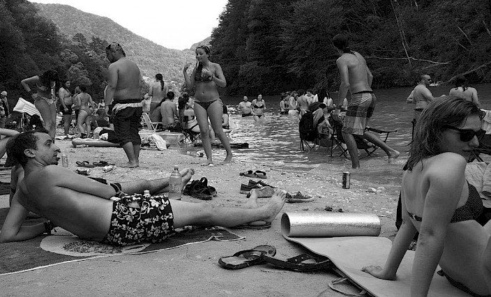Visoke temperature pa so tudi letos poskrbele, da ledeno mrzla voda Soče ni ovira za namakanje nog ali plavanje. Gajba pira, glasba (ali rjovenje in dretje obiskovalcev, ki navdušeno in tradicionalno čez celo plažo kličejo in iščejo Marjana*), stolček v vodi, praženje na soncu in »lenitis« so definicija dopusta.
