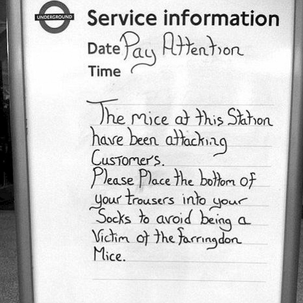 Potniki na podzemni železnici so prestrašeni zapustili postajo, potem ko jih je obvestilo svarilo pred zlobnimi ‘Farringdon’ mišmi, in opozarjalo naj si hlače zataknejo za nogavice.