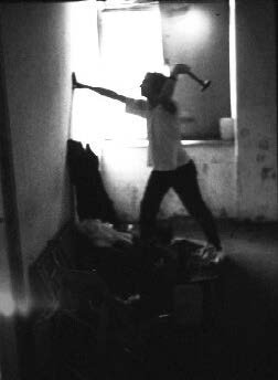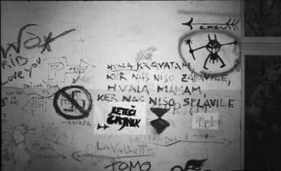 Škatla mojih otroških voščenk, ki jih prinesem s sabo, nastavim na polico in na okenski okvir zapišem par srčkov, se kmalu spremeni v iskan objekt. V nekaj dneh stene krasijo neskončne freske in slogani.